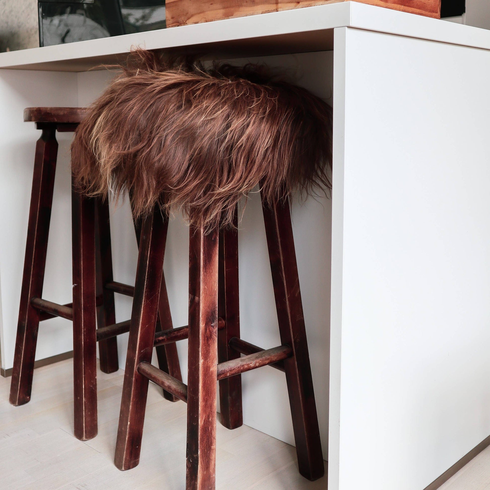 Sheepskin seat seats. These chairpads are measured on the leather side 37 x 37 cm and fall nicely over the seat with their beautiful long hair.