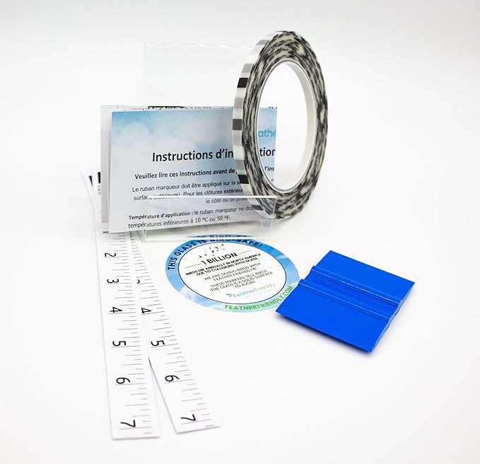 - Roll of Feather Friendly® Small-format DIY markers, two paper measuring tapes, one squeegee, one installation instruction sheet, and one bird-safe sticker.