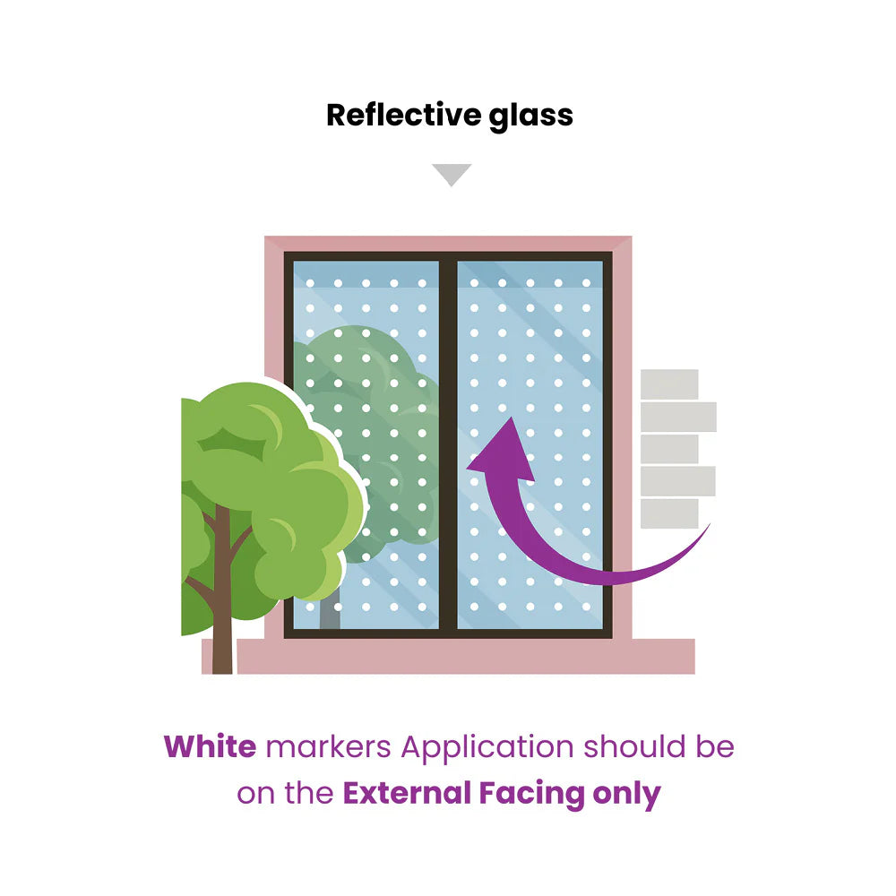 - For outdoor clear panels, apply markers to the side where more bird strikes occur.