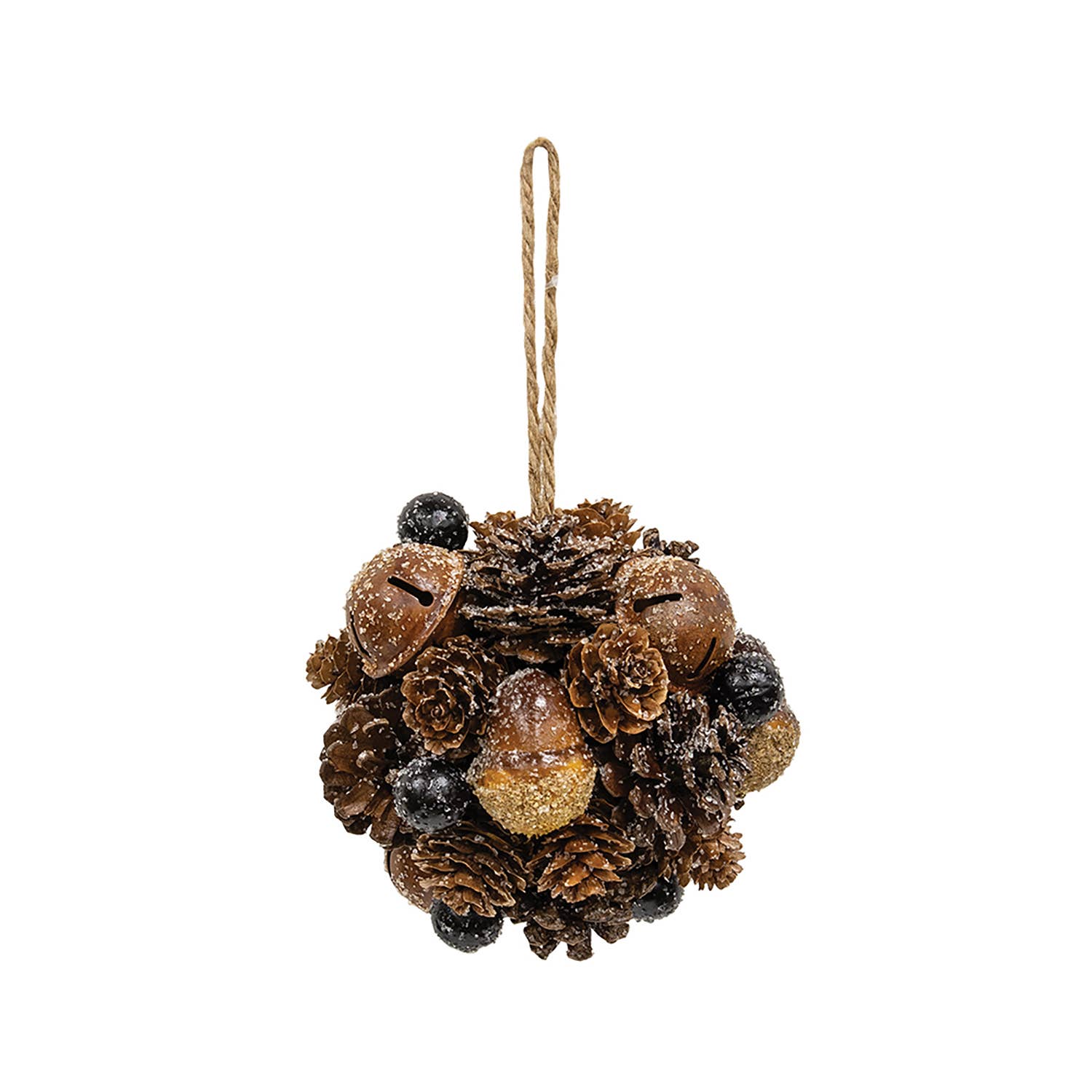 Bring alluring natural notes to the Winter farmhouse with the Frosted Deer Run Hanging Ball, 5". This ball ornament is made of natural pinecones and foam acorns with black foam berries. Rusty-colored metal jingle bells emerge from the surface of the ball. This 5" diameter hanging ball is finished with a dusting of sugary glitter for an icy feel. The jute hanger at the top allows for hanging on hooks, knobs or string a few of these along a Winter garland for a lovely woodland display.