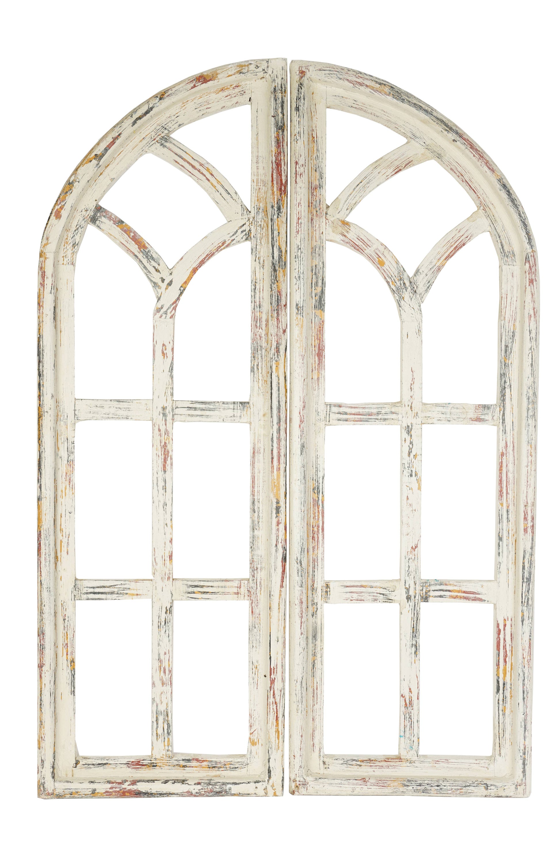 Handmade out of wood and painted in different layers of whitewashed tones. If you place them outside, seal them with a clear polyurethane sealer. This window measures about 12x36 inches each panel. So together the entire pair measures 24x36. These are decorative and not REAL windows.