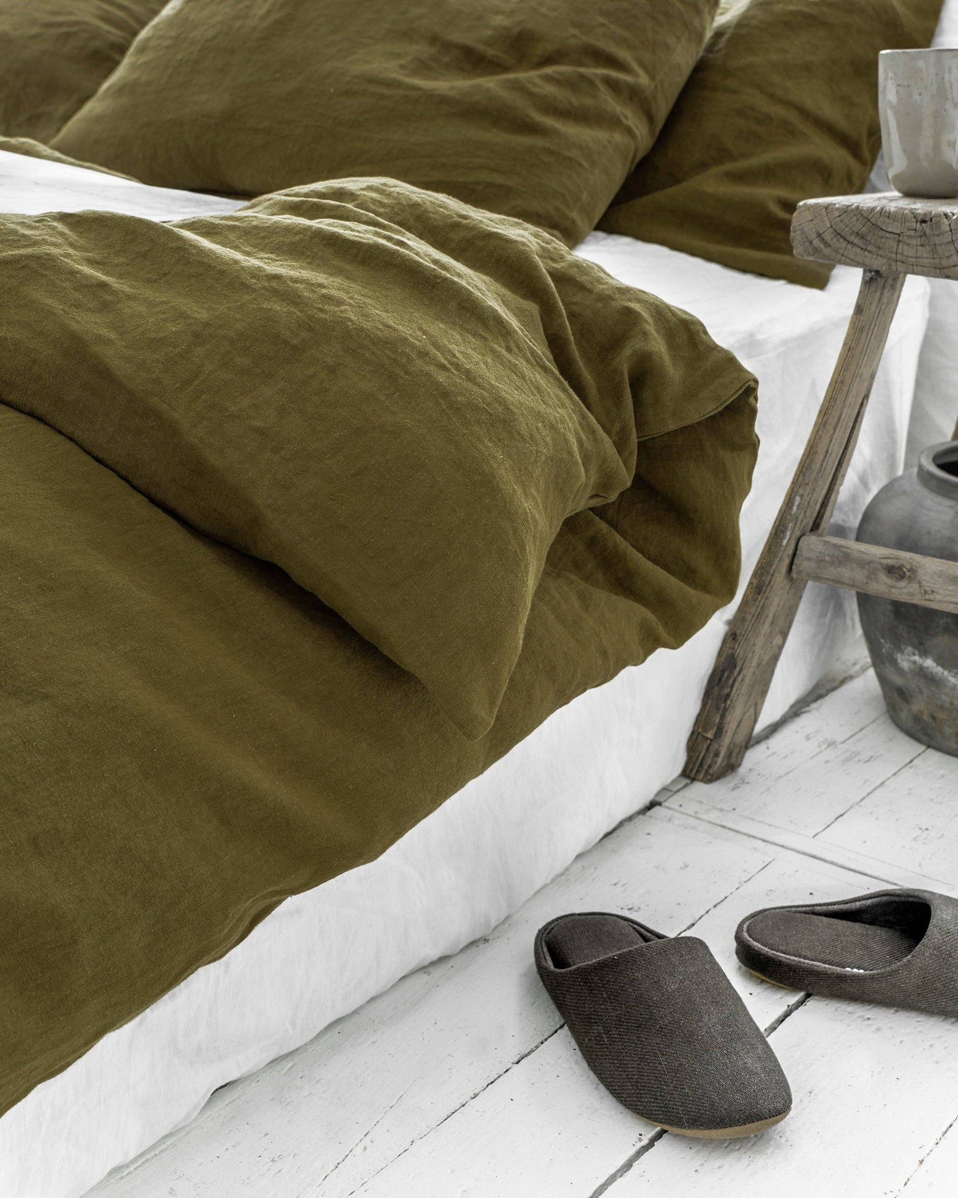 Linen duvet cover in olive green color. Add playfulness to your bedroom and improve your sleep with our linen duvet covers that are soft, highly breathable, and hypoallergenic. The natural properties of linen guarantee the feeling of comfort all year round.