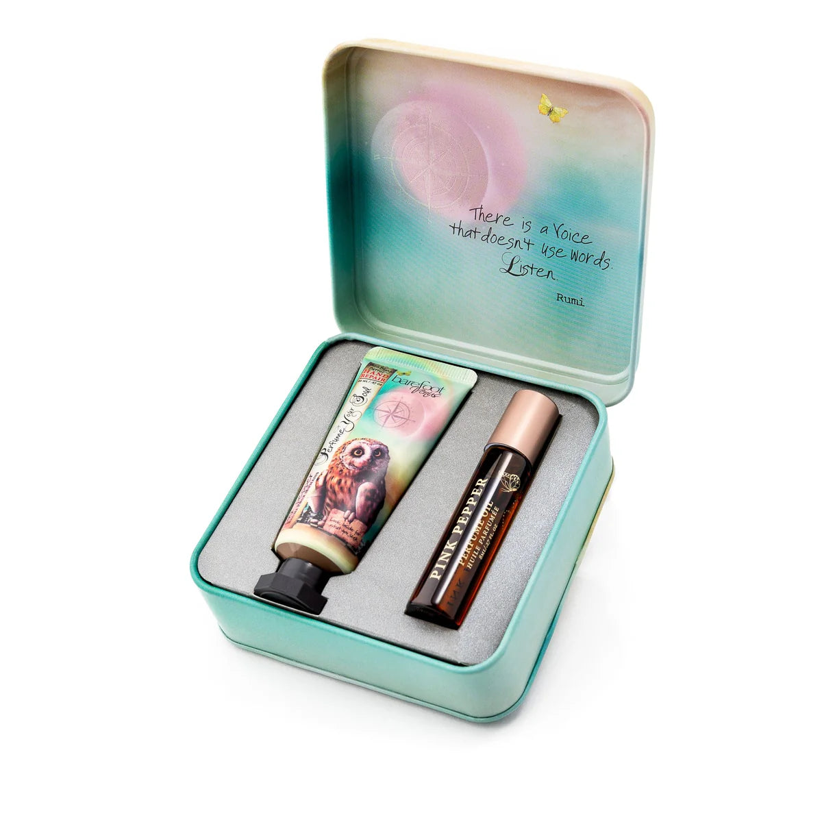 A perfect pair including a Mini Instant Hand Repair and a Rollerball Perfume Oil inside a beautiful keepsake tin.