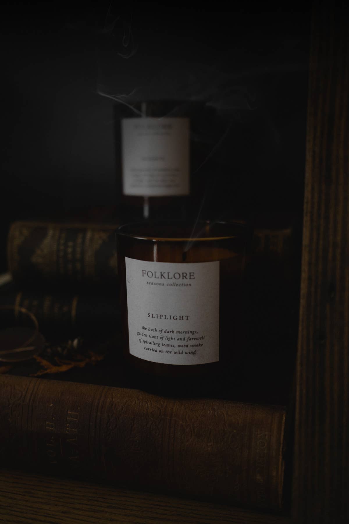 SLIPLIGHT the hush of dark mornings, golden slant of light and farewell of spiralling leaves, wood smoke carried on the wild wind with notes of: roasted chestnut, wood smoke, clove, cedar, patchouli DETAILS • 220g/7.7 oz • Up to 60 hours burn time • Recyclable amber glass vessel • 100% Sustainable and natural soy wax • Vegan & cruelty free • Made in Canada in our garden studio.