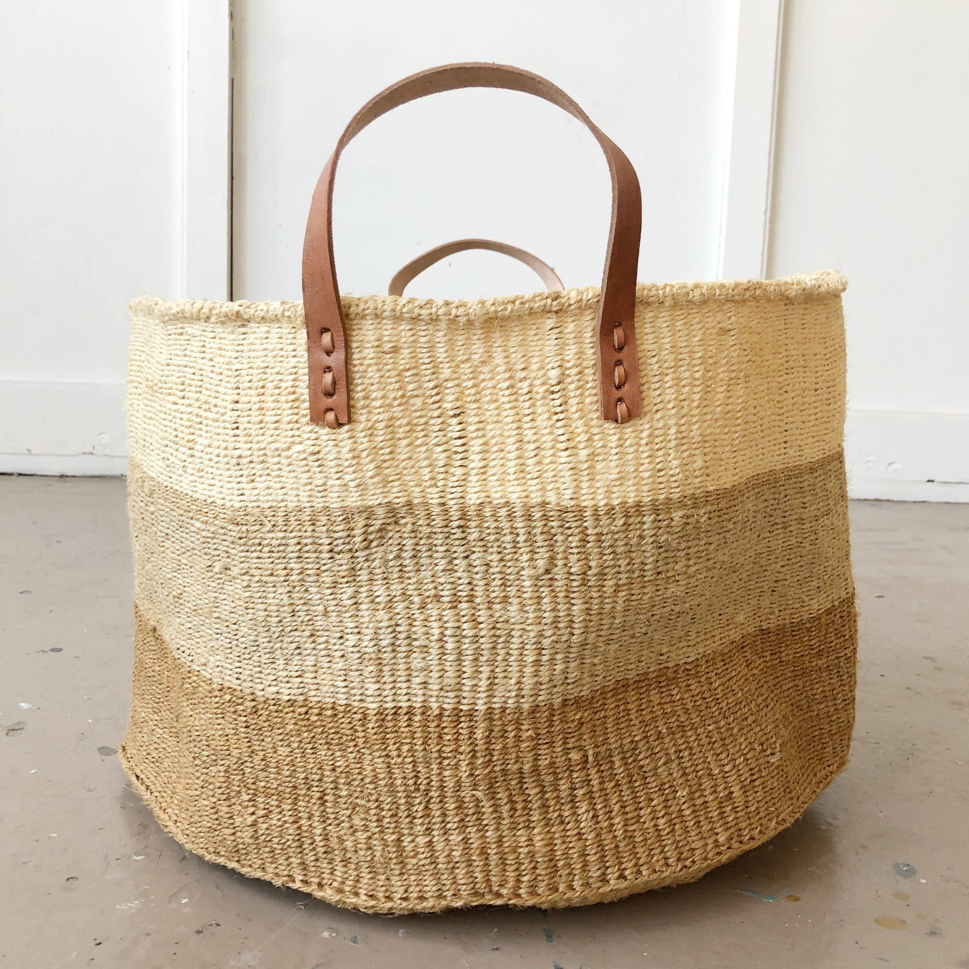 This sisal, woven floor basket is handmade by a weaving cooperative in southeastern Kenya. The women hand-dye the sisal fibers and weave them into these beautiful works of art. This basket has leather handles and is great for blankets, toys, and odds & ends.